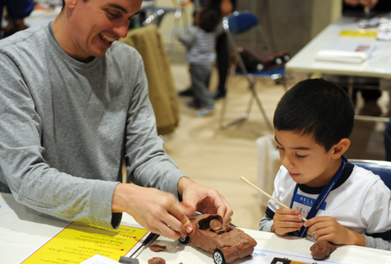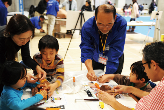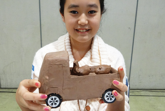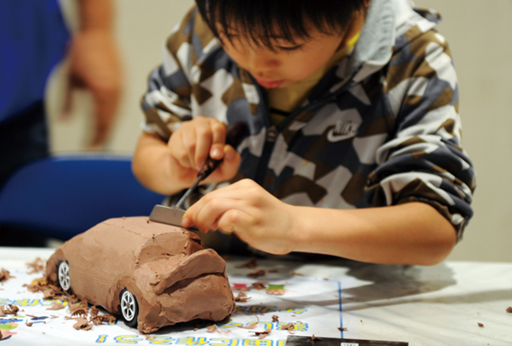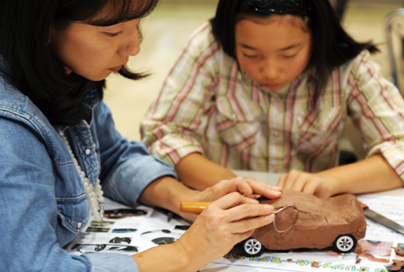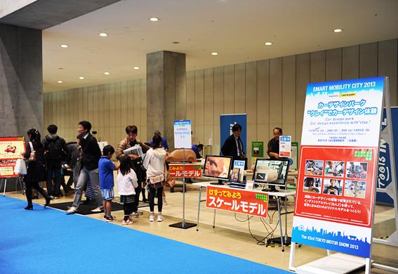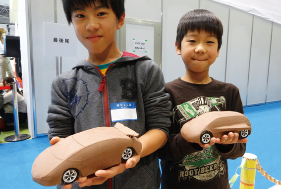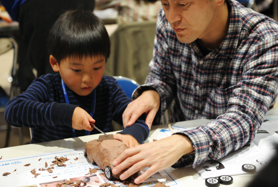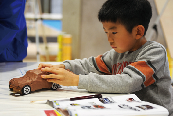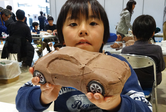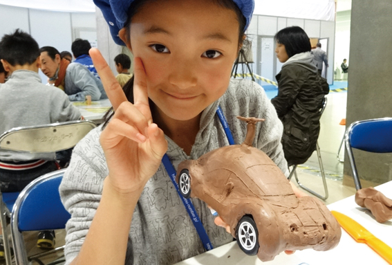 During the workshop, kids can make their ideal cars out of clay together with instructors who are experienced professional clay modelers from Japanese automotive makers. In addition, we put 2 of 1/4 clay scale models. During weekend of the Motor Show, anybody can come to the models and freely apply, scrape the models with professional clay modelers.